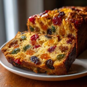 A dense, spice-infused fruitcake packed with candied fruits and nuts, aged with brandy for a rich, festive flavor.