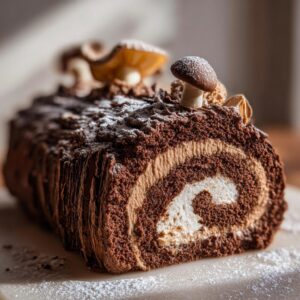 Once your cake is completely cool (and I mean *truly* cool – warm cake will fall apart!), carefully unroll it. Spread that glorious chocolate buttercream all over the cake, leaving a tiny border around the edges. Now, reroll the cake tightly, but this time, no towel! Just roll the cake itself. Place it seam-side down on your serving platter. Use the rest of that chocolate buttercream to frost the outside. Don’t be perfect here! Use a spatula or even a fork to create a bark-like texture – embrace the rustic look! Now for the fun part: decorating! Arrange your meringue mushrooms around the base, tuck in a few little sprigs of fresh rosemary to look like pine branches, and give everything a light dusting of powdered sugar to look like a snowy winter forest. Ta-da! You’ve just made a stunning Yule log!